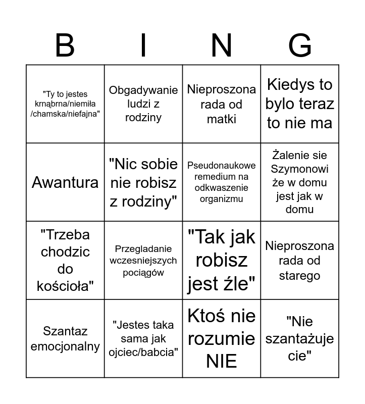 This bingo card has 16 words: "Jestes taka sama jak ojciec/babcia", Nieproszona rada od starego, Nieproszona rada od matki, "Ty to jestes krnąbrna/niemiła /chamska/niefajna", "Trzeba chodzic do kościoła", Obgadywanie ludzi z rodziny, "Tak jak robisz jest źle", Ktoś nie rozumie NIE, Awantura, "Nic sobie nie robisz z rodziny", Szantaz emocjonalny, Kiedys to bylo teraz to nie ma, Przegladanie wczesniejszych pociągów, Żalenie sie Szymonowi że w domu jest jak w domu, Pseudonaukowe remedium na odkwaszenie organizmu and "Nie szantażuje cie".
