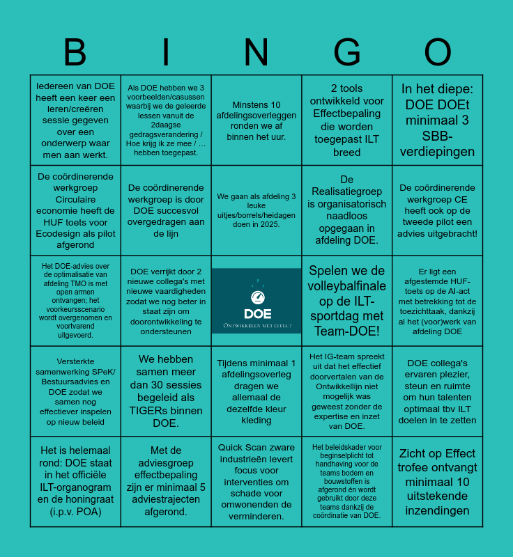 This bingo card has a free space and 24 words: We hebben samen meer dan 30 sessies begeleid als TIGERs binnen DOE., Met de adviesgroep effectbepaling zijn er minimaal 5 adviestrajecten afgerond., We gaan als afdeling 3 leuke uitjes/borrels/heidagen doen in 2025., Het is helemaal rond: DOE staat in het officiële ILT-organogram en de honingraat (i.p.v. POA), In het diepe: DOE DOEt minimaal 3 SBB-verdiepingen, Iedereen van DOE heeft een keer een leren/creëren sessie gegeven over een onderwerp waar men aan werkt., De coördinerende werkgroep Circulaire economie heeft de HUF toets voor Ecodesign als pilot afgerond, Als DOE hebben we 3 voorbeelden/casussen waarbij we de geleerde lessen vanuit de 2daagse gedragsverandering / Hoe krijg ik ze mee / … hebben toegepast., Spelen we de volleybalfinale op de ILT-sportdag met Team-DOE!, Tijdens minimaal 1 afdelingsoverleg dragen we allemaal de dezelfde kleur kleding, De Realisatiegroep is organisatorisch naadloos opgegaan in afdeling DOE., Het DOE-advies over de optimalisatie van afdeling TMO is met open armen ontvangen; het voorkeursscenario wordt overgenomen en voortvarend uitgevoerd., Het IG-team spreekt uit dat het effectief doorvertalen van de Ontwikkellijn niet mogelijk was geweest zonder de expertise en inzet van DOE., DOE collega's ervaren plezier, steun en ruimte om hun talenten optimaal tbv ILT doelen in te zetten, De coördinerende werkgroep is door DOE succesvol overgedragen aan de lijn, Het beleidskader voor beginselplicht tot handhaving voor de teams bodem en bouwstoffen is afgerond én wordt gebruikt door deze teams dankzij de coördinatie van DOE., Er ligt een afgestemde HUF-toets op de AI-act met betrekking tot de toezichttaak, dankzij al het (voor)werk van afdeling DOE, Minstens 10 afdelingsoverleggen ronden we af binnen het uur., De coördinerende werkgroep CE heeft ook op de tweede pilot een advies uitgebracht!, DOE verrijkt door 2 nieuwe collega's met nieuwe vaardigheden zodat we nog beter in staat zijn om doorontwikkeling te ondersteunen, Zicht op Effect trofee ontvangt minimaal 10 uitstekende inzendingen, Versterkte samenwerking SPeK/ Bestuursadvies en DOE zodat we samen nog effectiever inspelen op nieuw beleid, 2 tools ontwikkeld voor Effectbepaling die worden toegepast ILT breed and Quick Scan zware industrieën levert focus voor interventies om schade voor omwonenden de verminderen..