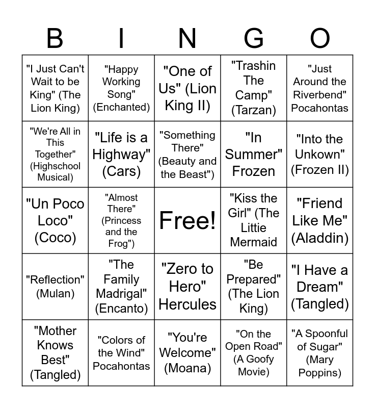 This bingo card has a free space and 45 words: "Hawaiian Roller Coaster Ride"(Lile and Stitch), "A Spoonful of Sugar" (Mary Poppins), "I'll Make a Man out of You" (Mulan), "Mother Knows Best" (Tangled), "I2I" (A Goofy Movie), "On the Open Road" (A Goofy Movie), "One of Us" (Lion King II), " Like Other Girls" (Mulan II), "Just Around the Riverbend" Pocahontas, "Colors of the Wind" Pocahontas, "Trashin The Camp" (Tarzan), "Kiss the Girl" (The Littie Mermaid, "Zero to Hero" Hercules, "The Family Madrigal" (Encanto), "Friends on the Other Side" (The Princess and the Frog), "You're Welcome" (Moana), "I Always Wanted a Brother" (Mufasa: The Lion King), "Un Poco Loco" (Coco), "Poor Unfortunate Souls" (The Little Mermaid), "Into the Unkown" (Frozen II), "Happy Working Song" (Enchanted), "That's How You Know" (Enchanted), Nobody Like U ("Turning Red"), "I Just Can't Wait to be King" (The Lion King), "What's This?" (Nightmare Before Christmas), "Friend Like Me" (Aladdin), "The Bare Necessities" (The Jungle Book), "Out There" (The Hunchback of Notre Dame), "Be Prepared" (The Lion King), "Reflection" (Mulan), "This is Halloween" (Nightmare Before Christmas), "I Have a Dream" (Tangled), "Cruella DeVille" (101 Dalmations), "I won't Say I'm In Love" (Hercules), "A Whole New World" (Aladdin), "Almost There" (Princess and the Frog"), "You've Got a Friend in Me" (Toy Story), "Once Upon a Dream" (Sleeping Beauty), "How Far I'll Go" (Moana), "Something There" (Beauty and the Beast"), "We're All in This Together" (Highschool Musical), "In Summer" Frozen, "Rotten to the Core" (Descendants), "Life is a Highway" (Cars) and "Hakuna Matata" (The Lion King).