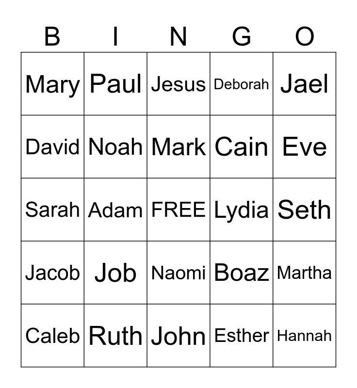 This bingo card has a free space and 24 words: Job, Ruth, Mark, Caleb, Jael, Mary, David, Paul, Lydia, Naomi, Cain, Sarah, Boaz, Martha, Noah, Esther, Seth, Jesus, Eve, Adam, Hannah, Jacob, Deborah and John.