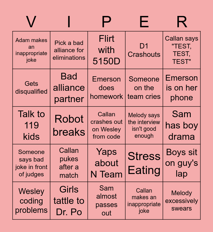 This bingo card has 25 words: Callan pukes after a match, Sam almost passes out, Emerson does homework, Wesley coding problems, Callan says "TEST, TEST, TEST", Adam makes an inappropriate joke, Gets disqualified, Pick a bad alliance for eliminations, Melody says the interview isn't good enough, Yaps about N Team, Someone on the team cries, Talk to 119 kids, Stress Eating, Boys sit on guy's lap, Bad alliance partner, Melody excessively swears, Sam has boy drama, Flirt with 5150D, Emerson is on her phone, Robot breaks, Callan crashes out on Wesley from code, Girls tattle to Dr. Po, Someone says bad joke in front of judges, D1 Crashouts and Callan makes an inappropriate joke.