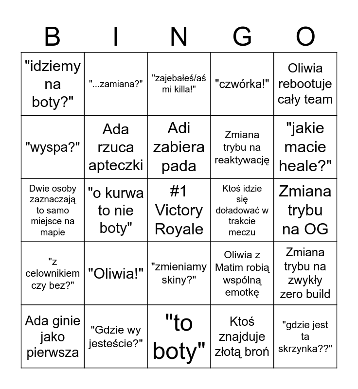 This bingo card has a free space and 24 words: "Oliwia!", "Gdzie wy jesteście?", Adi zabiera pada, Ada ginie jako pierwsza, Oliwia rebootuje cały team, "idziemy na boty?", "wyspa?", "...zamiana?", Ktoś idzie się doładować w trakcie meczu, "zmieniamy skiny?", Zmiana trybu na reaktywację, Dwie osoby zaznaczają to samo miejsce na mapie, Oliwia z Matim robią wspólną emotkę, Zmiana trybu na zwykły zero build, Ada rzuca apteczki, Ktoś znajduje złotą broń, Zmiana trybu na OG, "zajebałeś/aś mi killa!", "jakie macie heale?", "o kurwa to nie boty", "gdzie jest ta skrzynka??", "z celownikiem czy bez?", "czwórka!" and "to boty".