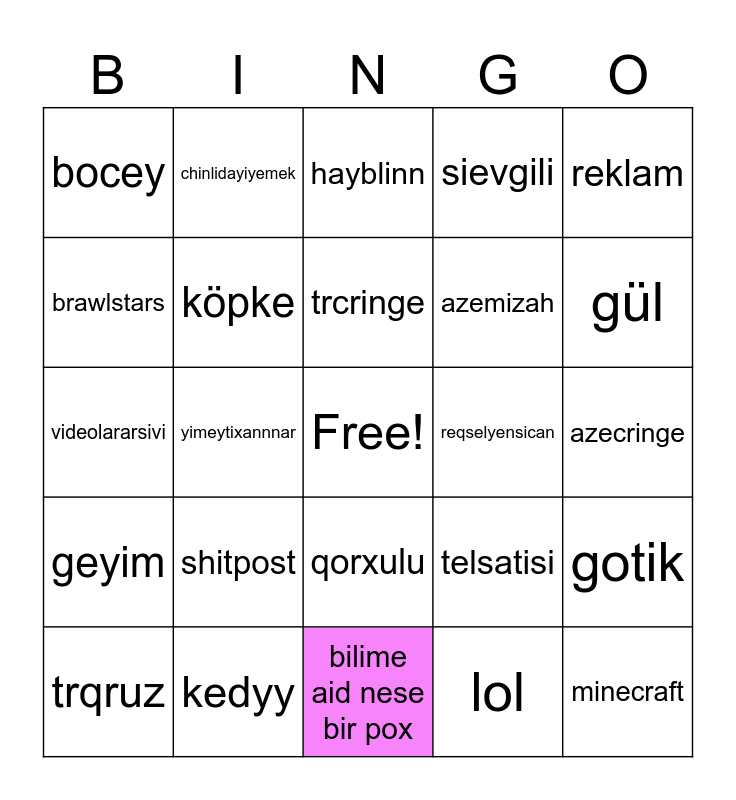This bingo card has a free space and 24 words: shitpost, kedyy, trcringe, trqruz, reklam, bocey, brawlstars, chinlidayiyemek, reqselyensican, qorxulu, azemizah, videolararsivi, telsatisi, gotik, köpke, lol, azecringe, hayblinn, gül, yimeytixannnar, minecraft, geyim, sievgili and bilime aid nese bir pox.
