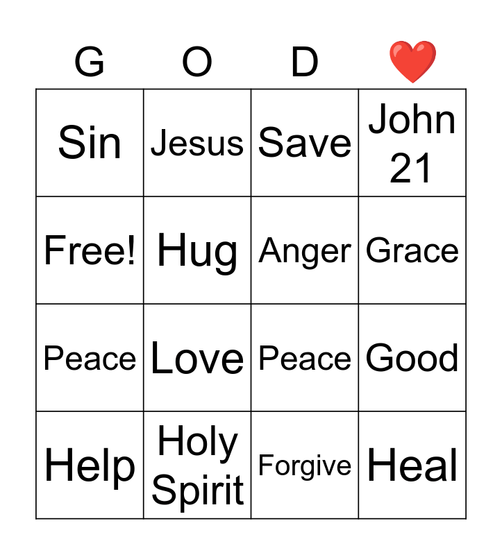 This bingo card has 16 words: Holy Spirit, Good, Save, Sin, Peace, Jesus, Peace, Forgive, Free!, Hug, Help, John 21, Love, Grace, Anger and Heal.