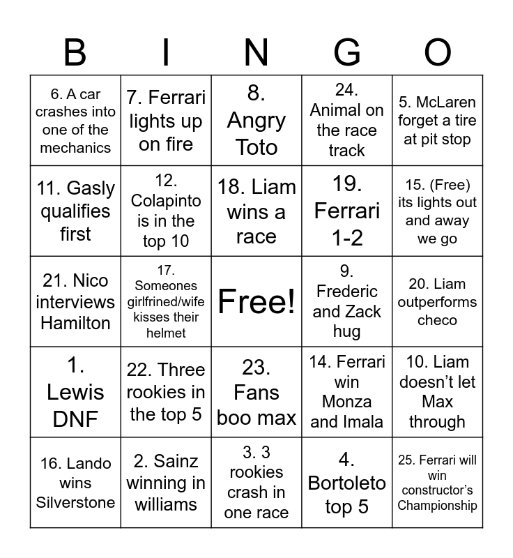 This bingo card has a free space and 25 words: 1. Lewis DNF, 2. Sainz winning in williams, 3. 3 rookies crash in one race, 4. Bortoleto top 5, 5. McLaren forget a tire at pit stop, 6. A car crashes into one of the mechanics, 7. Ferrari lights up on fire, 8. Angry Toto, 9. Frederic and Zack hug, 10. Liam doesn’t let Max through, 11. Gasly qualifies first, 12. Colapinto is in the top 10, 13. Yuki crashes into the wall, 14. Ferrari win Monza and Imala, 15. (Free) its lights out and away we go, 16. Lando wins Silverstone, 17. Someones girlfrined/wife kisses their helmet, 18. Liam wins a race, 19. Ferrari 1-2, 20. Liam outperforms checo, 21. Nico interviews Hamilton, 22. Three rookies in the top 5, 23. Fans boo max, 24. Animal on the race track and 25. Ferrari will win constructor’s Championship.