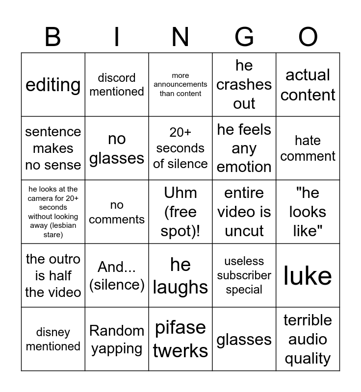 This bingo card has a free space and 24 words: And...(silence), Random yapping, 20+ seconds of silence, disney mentioned, actual content, editing, sentence makes no sense, discord mentioned, entire video is uncut, he laughs, he feels any emotion, he looks at the camera for 20+ seconds without looking away (lesbian stare), useless subscriber special, luke, no glasses, glasses, "he looks like", more announcements than content, hate comment, no comments, terrible audio quality, the outro is half the video, he crashes out and pifase twerks.