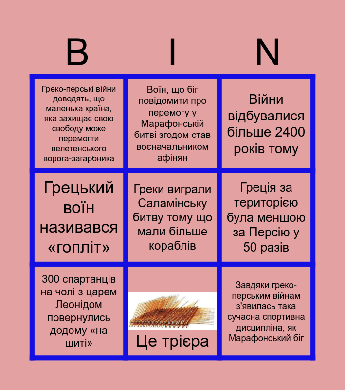 This bingo card has 1 images, a free space and 8 words: Греція за територією була меншою за Персію у 50 разів, Війни відбувалися більше 2400 років тому, Воїн, що біг повідомити про перемогу у Марафонській битві згодом став воєначальником афінян, 300 спартанців на чолі з царем Леонідом повернулись додому «на щиті», Греко-перські війни доводять, що маленька країна, яка захищає свою свободу може перемогти велетенського ворога-загарбника, Завдяки греко-перським війнам з'явилась така сучасна спортивна дисципліна, як Марафонський біг, Грецький воїн називався «гопліт» and Це трієра.