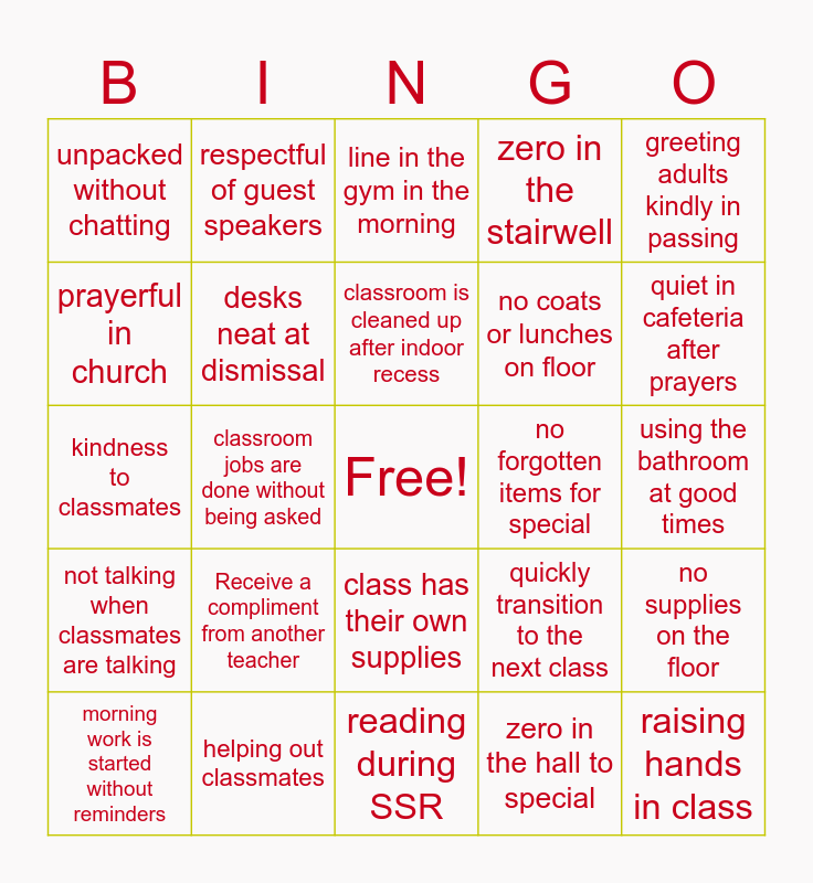 This bingo card has a free space and 24 words: Receive a compliment from another teacher, helping out classmates, classroom is cleaned up after indoor recess, morning work is started without reminders, greeting adults kindly in passing, unpacked without chatting, prayerful in church, respectful of guest speakers, no forgotten items for special, class has their own supplies, no coats or lunches on floor, kindness to classmates, quickly transition to the next class, no supplies on the floor, desks neat at dismissal, zero in the hall to special, using the bathroom at good times, line in the gym in the morning, quiet in cafeteria after prayers, classroom jobs are done without being asked, raising hands in class, not talking when classmates are talking, zero in the stairwell and reading during SSR.