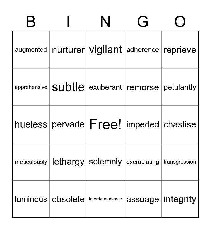 This bingo card has a free space and 29 words: luminous, ironic, pervade, languid, augmented, vigilant, subtle, lethargy, impeded, obsolete, chastise, integrity, interdependence, assuage, petulantly, solitude, solemnly, meticulously, reprieve, hueless, excruciating, conveyance, remorse, apprehensive, adherence, nurturer, transgression, exuberant and fretful.