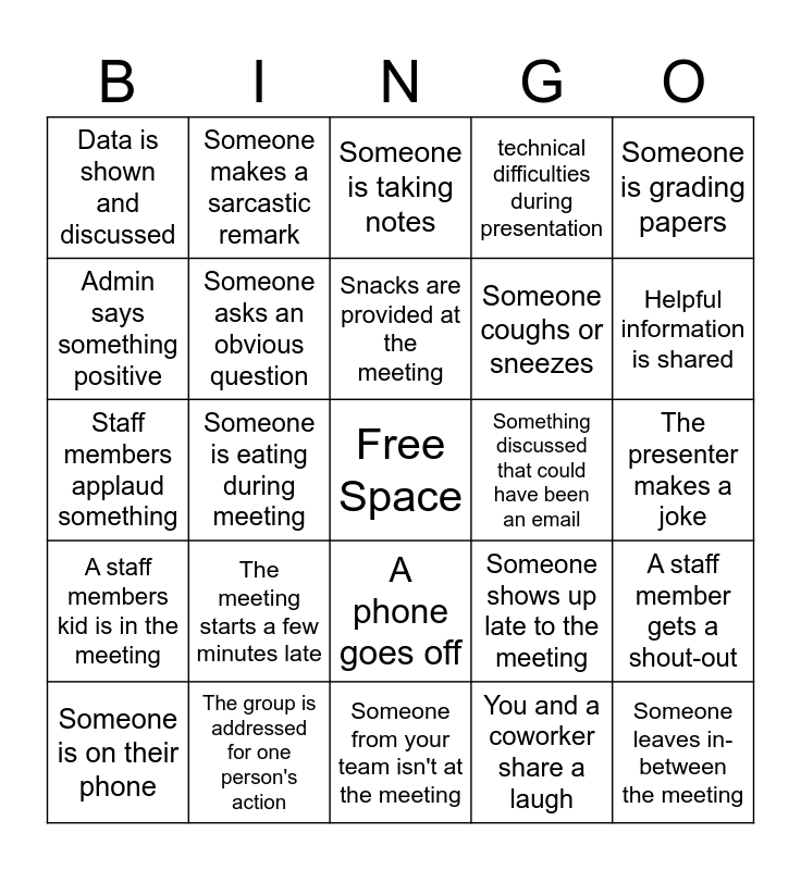 This bingo card has a free space and 24 words: The meeting starts a few minutes late, The group is addressed for one person's action, Snacks are provided at the meeting, Someone is on their phone, Someone is grading papers, Data is shown and discussed, Admin says something positive, Someone makes a sarcastic remark, Something discussed that could have been an email, A phone goes off, Someone coughs or sneezes, Staff members applaud something, Someone shows up late to the meeting, A staff member gets a shout-out, Someone asks an obvious question, You and a coworker share a laugh, The presenter makes a joke, Someone is taking notes, Helpful information is shared, Someone is eating during meeting, Someone leaves in-between the meeting, A staff members kid is in the meeting, technical difficulties during presentation and Someone from your team isn't at the meeting.