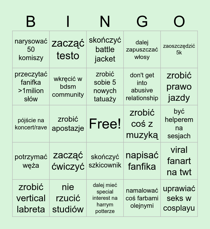 This bingo card has a free space and 24 words: zacząć ćwiczyć, nie rzucić studiów, zrobić sobie 5 nowych tatuaży, zrobić vertical labreta, zaoszczędzić 5k, narysować 50 komiszy, przeczytać fanifka >1milion słów, zacząć testo, zrobić coś z muzyką, skończyć szkicownik, don't get into abusive relationship, pójście na koncert/rave, napisać fanfika, viral fanart na twt, wkręcić w bdsm community, namalować coś farbami olejnymi, być helperem na sesjach, skończyć battle jacket, zrobić prawo jazdy, zrobić apostazje, uprawiać seks w cosplayu, potrzymać węża, dalej zapuszczać włosy and dalej mieć special interest na harrym potterze.