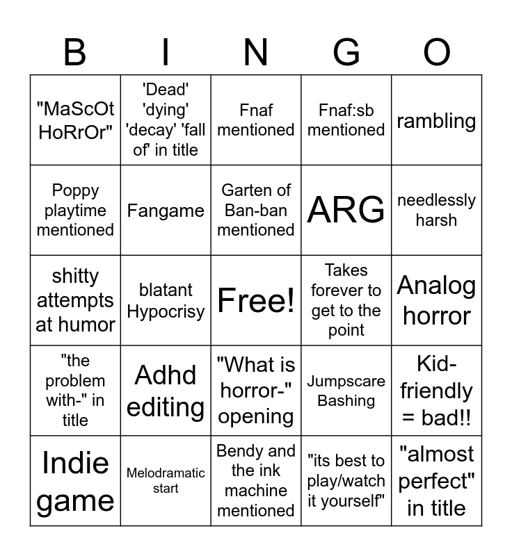 This bingo card has a free space and 24 words: Adhd editing, Melodramatic start, Garten of Ban-ban mentioned, Indie game, rambling, "MaScOt HoRrOr", Poppy playtime mentioned, 'Dead' 'dying' 'decay' 'fall of' in title, Takes forever to get to the point, "What is horror-" opening, ARG, shitty attempts at humor, Jumpscare Bashing, Kid-friendly = bad!!, Fangame, "its best to play/watch it yourself", Analog horror, Fnaf mentioned, needlessly harsh, blatant Hypocrisy, "almost perfect" in title, "the problem with-" in title, Fnaf:sb mentioned and Bendy and the ink machine mentioned.