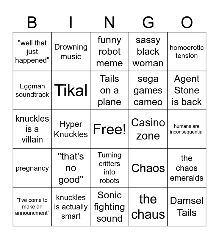 This bingo card has a free space and 24 words: "that's no good", knuckles is actually smart, Tails on a plane, "I've come to make an announcment", homoerotic tension, "well that just happened", Eggman soundtrack, Drowning music, Casino zone, Turning critters into robots, sega games cameo, knuckles is a villain, Chaos, the chaos emeralds, Tikal, the chaus, humans are inconsequential, funny robot meme, Agent Stone is back, Hyper Knuckles, Damsel Tails, pregnancy, sassy black woman and Sonic fighting sound.