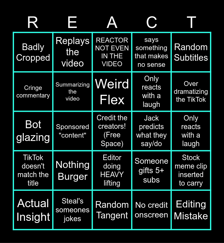 This bingo card has a free space and 38 words: Forgets to React, Freebooting a freebooted video, Shaky Cam, Summarizing the video, Stock meme clip inserted to carry, Nothing Burger, Weird Flex, Talking over the person in the video, Random Subtitles, Only reacts with a laugh, Sponsored "content", says something that makes no sense, Editing Mistake, Only reacts with a laugh, Cringe commentary, TikTok doesn't match the title, Weird inserted biases, REACTOR NOT EVEN IN THE VIDEO, Random graphic that adds nothing, Jack predicts what they say/do, Badly Cropped, Steal's someones jokes, Over dramatizing the TikTok, Actual Insight, ..that was it?, Random Tangent, Just quotes the OG video, Bullies person in video, Very loud, No links in description, "This is me...", Editor doing HEAVY lifting, No credit onscreen, Replays the video, First time chatter, Someone gifts 5+ subs, Bot glazing and ReactBot's reaction is better.