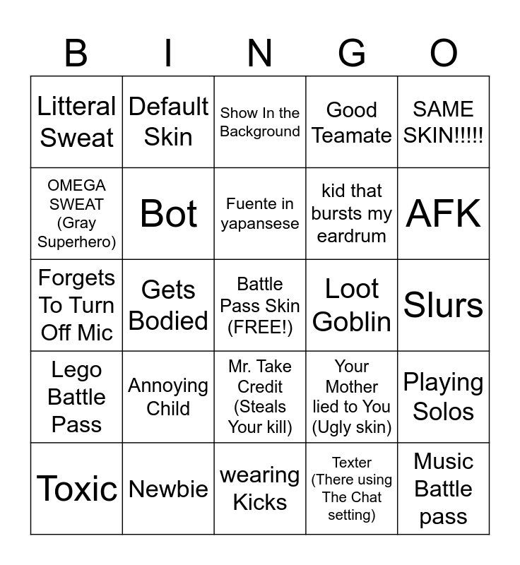 This bingo card has a free space and 24 words: Annoying Child, Newbie, Fuente in yapansese, Toxic, SAME SKIN!!!!!, Litteral Sweat, OMEGA SWEAT (Gray Superhero), Default Skin, Loot Goblin, Mr. Take Credit (Steals Your kill), kid that bursts my eardrum, Forgets To Turn Off Mic, Your Mother lied to You (Ugly skin), Playing Solos, Bot, Texter (There using The Chat setting), Slurs, Show In the Background, AFK, Gets Bodied, Music Battle pass, Lego Battle Pass, Good Teamate and wearing Kicks.