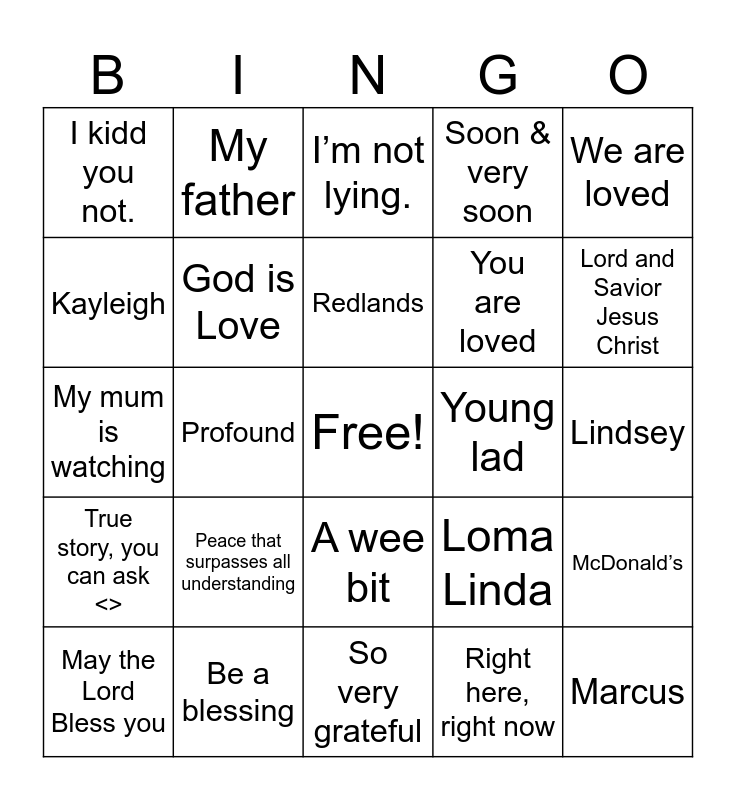 This bingo card has a free space and 38 words: Greek, Newbold, John 3:16, God is Love, McDonald’s, Peace that surpasses all understanding, Redlands, Montana, We are loved, You are loved, Profound, Soon & very soon, Marcus, Lindsey, Kayleigh, True story, you can ask <>, I’m telling you the truth., I’m not lying., We were friends in seminary, Young lad, I kidd you not., Be a blessing, Lord and Savior Jesus Christ, May the Lord Bless you, Somehow, someway, So very grateful, I am blessed, Bless & guide, Facebook, My mother, Hebrew, A wee bit, Right here, right now, My father, England, Loma Linda, My mum is watching and Yucaipa.
