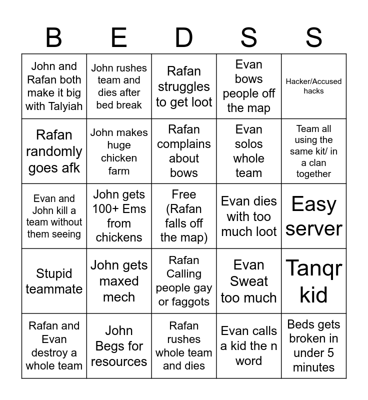 This bingo card has a free space and 24 words: Rafan and Evan destroy a whole team, John gets maxed mech, Rafan complains about bows, Evan calls a kid the n word, Hacker/Accused hacks, John and Rafan both make it big with Talyiah, John rushes team and dies after bed break, Rafan struggles to get loot, Evan dies with too much loot, Easy server, Evan and John kill a team without them seeing, John makes huge chicken farm, Evan Sweat too much, Tanqr kid, Rafan randomly goes afk, John Begs for resources, Rafan rushes whole team and dies, Evan bows people off the map, Team all using the same kit/ in a clan together, Stupid teammate, John gets 100+ Ems from chickens, Rafan Calling people gay or faggots, Evan solos whole team and Beds gets broken in under 5 minutes.