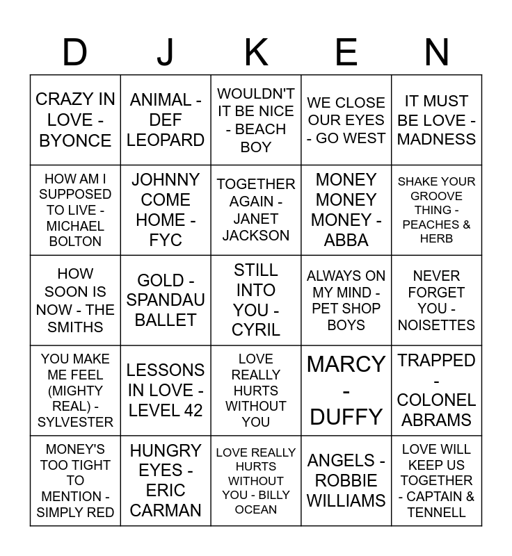 This bingo card has 50 words: FOLLOW YOU FOLLOW ME - GENISIS, STILL INTO YOU - CYRIL, RUN TO YOU - BRYAN ADAMS, LOVE REALLY HURTS WITHOUT YOU - BILLY OCEAN, LESSONS IN LOVE - LEVEL 42, I STILL HAVEN'T FOUND WHAT I'M LOOKING FOR - U2, ANIMAL - DEF LEOPARD, NEW SENSATION - INXS, HOW AM I SUPPOSED TO LIVE - MICHAEL BOLTON, TWO HEARTS - PHIL COLLINS, JOHNNY COME HOME - FYC, WE CLOSE OUR EYES - GO WEST, TRAPPED - COLONEL ABRAMS, MARCY - DUFFY, CRY TO ME - KILOTILE, ROCKABYE - CLEAN BANDIT, TOGETHER AGAIN - JANET JACKSON, ALWAYS ON MY MIND - PET SHOP BOYS, GOTTA GO HOME - BONEY M, IT MUST BE LOVE - MADNESS, GOLD - SPANDAU BALLET, ANGELS - ROBBIE WILLIAMS, CRAZY IN LOVE - BYONCE, MONEY MONEY MONEY - ABBA, I KNOW I WANT YOU - PITBUL, LOVE WILL KEEP US TOGETHER - CAPTAIN & TENNELL, SHAKE YOUR GROOVE THING - PEACHES & HERB, EVERYBODY'S TALKIN' NILSSON, WOULDN'T IT BE NICE - BEACH BOY, LOVE REALLY HURTS WITHOUT YOU, MAN. I FEEL LIKE A WOMAN - SHANIA TWAIN, KNOCK ON WOOD - AMII STEWART, BABBUSHKA - KATE BUSH, AIN'T NOBODY - CHAKA KAHN, HUNGRY EYES - ERIC CARMAN, THEY DON'T KNOW - TRACY ULMAN, AMAZED - LONESTAR, SILENCE IS GOLDEN - THE TREMELOES, ALONE - HEART, NEVER FORGET YOU - NOISETTES, LIVIN' LA VIDA LOCA - RICKY MARTIN, I'TS NOT UNUSUAL - TOM JONES, SMELLS LIKE TEEN SPIRIT - NIRVANA, I'M OUTTA LOVE - ANASTACIA, MONEY'S TOO TIGHT TO MENTION - SIMPLY RED, HOW SOON IS NOW - THE SMITHS, LITTLE BOO THANG - PAUL RUSSELL, FATHER FIGURE - GEORGE MICHAEL, YOU MAKE ME FEEL (MIGHTY REAL) - SYLVESTER and MILKSHAKE - KELIS.