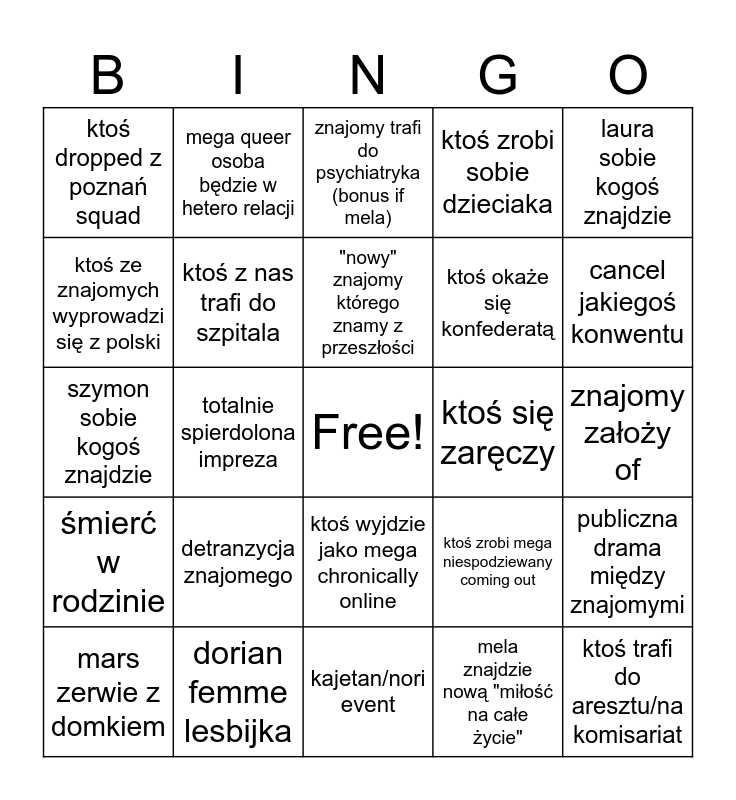 This bingo card has a free space and 24 words: detranzycja znajomego, dorian femme lesbijka, "nowy" znajomy którego znamy z przeszłości, mars zerwie z domkiem, laura sobie kogoś znajdzie, ktoś dropped z poznań squad, ktoś ze znajomych wyprowadzi się z polski, mega queer osoba będzie w hetero relacji, ktoś się zaręczy, ktoś wyjdzie jako mega chronically online, ktoś okaże się konfederatą, szymon sobie kogoś znajdzie, ktoś zrobi mega niespodziewany coming out, publiczna drama między znajomymi, ktoś z nas trafi do szpitala, mela znajdzie nową "miłość na całe życie", znajomy założy of, znajomy trafi do psychiatryka (bonus if mela), cancel jakiegoś konwentu, totalnie spierdolona impreza, ktoś trafi do aresztu/na komisariat, śmierć w rodzinie, ktoś zrobi sobie dzieciaka and kajetan/nori event.