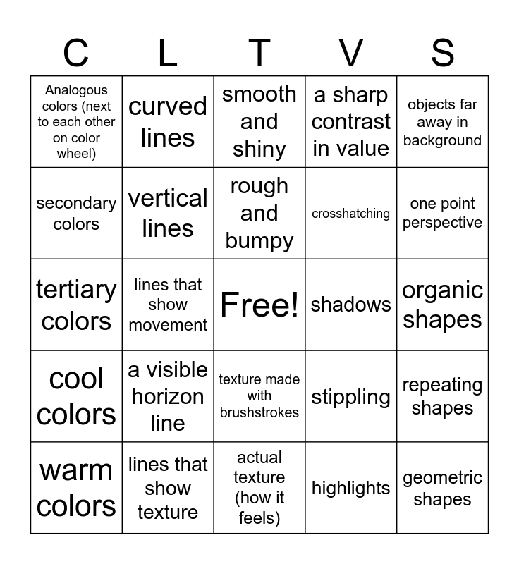 This bingo card has a free space and 34 words: primary colors, horizontal lines, implied texture (how it looks like it feels), a wide range of value, organic shapes, secondary colors, vertical lines, actual texture (how it feels), crosshatching, geometric shapes, tertiary colors, curved lines, highlights, overlapping shapes or objects, cool colors, lines that show movement, texture made with brushstrokes, shadows, repeating shapes, warm colors, lines that show texture, texture of an animals skin, scales, or fur., a sharp contrast in value, one point perspective, complementary colors (opposite on the color wheel), a visible horizon line, smooth and shiny, no range of value, objects far away in background, Analogous colors (next to each other on color wheel), paralell lines, rough and bumpy, stippling and objects close up in foreground.