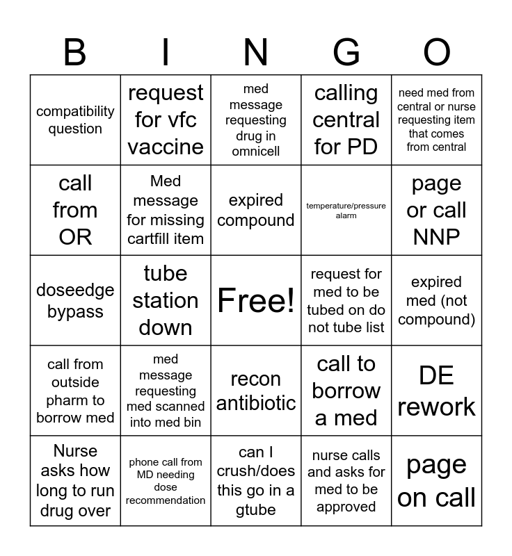This bingo card has a free space and 56 words: survanta, Nurse asks how long to run drug over, Receive strange item in the tube, compatibility question, can I crush/does this go in a gtube, Empty bottle/box on shelf, Med message for missing cartfill item, stat alteplase, temperature/pressure alarm, IV hoarding stats, calling central for PD, code response needed, picu missing med, nurse has <1 hour on a drip, move meds between omnicell, med request for order put in <10 min ago, need med from central or nurse requesting item that comes from central, tube station down, miss-filled med, page on call, request for med to be tubed on do not tube list, retail (break-in, counseling, nurse calling wrong #), call to borrow a med, med message requesting drug in omnicell, need new tackle box, expired compound, smog compound, premix station with >5 to prep, page or call NNP, rec from a consult service, med sent secure returns in tube, omnicell discrepancy, med not scanning (doseedge or nurse call), trauma B/stab code/OB c-section, expired med (not compound), call from OR, doseedge bypass, new LOS/EOS orders, call from outside pharm to borrow med, request for vfc vaccine, recon antibiotic, ID home med, status board clear, request for on call electrolytes, omnicell issue, med message requesting med scanned into med bin, phone call from MD needing dose recommendation, critical dose warning override, need to make dilution narc, med stored improperly, nurse calls and asks for med to be approved, epic queue clear, Door bell to pharmacy, IV room calls out for stock, DE rework and need to waste for a narc.