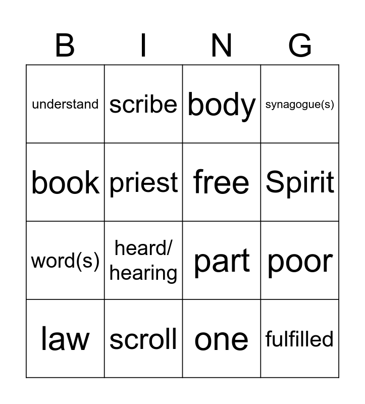 This bingo card has 16 words: law, scroll, body, synagogue(s), book, scribe, part, poor, understand, priest, one, Spirit, word(s), heard/ hearing, free and fulfilled.