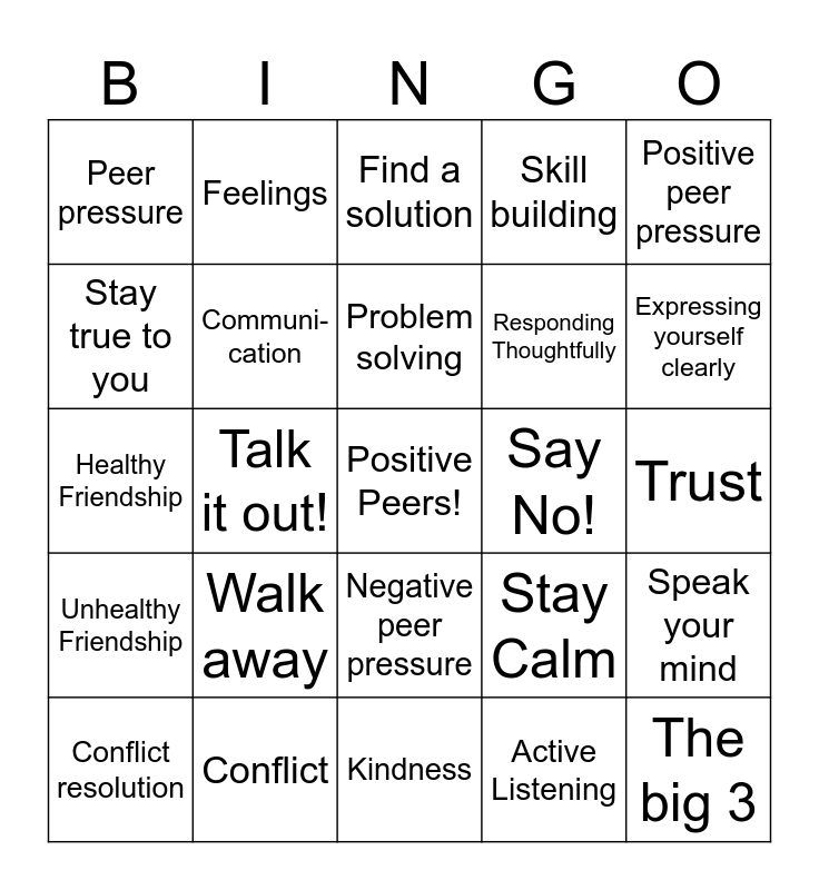 This bingo card has a free space and 30 words: Conflict, Friendship, Talk it out!, Respect, Peer pressure, Find a solution, Communi- cation, Negative peer pressure, Say No!, Kindness, Trust, The big 3, Active Listening, Listen to each other, Expressing yourself clearly, Emotions, Stay Calm, Unhealthy Friendship, Walk away, Positive peer pressure, Healthy Friendship, Good decisions, Feelings, Responding Thoughtfully, Stay true to you, Skill building, Speak your mind, Conflict resolution, Problem solving and Seek help.
