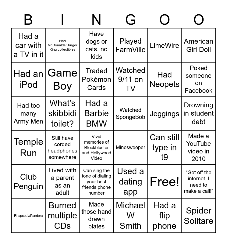 This bingo card has 37 words: Free!, Used a dating app, Had a flip phone, Had an iPod, Still have corded headphones somewhere, Jeggings, Game Boy, Michael W Smith, LimeWire, Rhapsody/Pandora, Poked someone on Facebook, Played FarmVille, Had too many Army Men, Had a Barbie BMW, American Girl Doll, Watched SpongeBob, Lived with a parent as an adult, Have dogs or cats, no kids, Drowning in student debt, What’s skibbidi toilet?, Had a car with a TV in it, Watched 9/11 on TV, Vivid memories of Blockbluster and Hollywood Video, Can still type in t9, Burned multiple CDs, Made a YouTube video in 2010, Had McDonalds/Burger King collectibles, Made those hand drawn plates, “Get off the internet, I need to make a call!”, Can sing the tone of dialing your best friends phone number, Windows Media Player, Minesweeper, Had Neopets, Club Penguin, Temple Run, Traded Pokémon Cards and Spider Solitare.