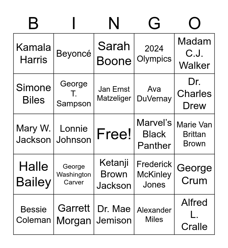 This bingo card has a free space and 24 words: George Washington Carver, Garrett Morgan, Jan Ernst Matzeliger, Bessie Coleman, Madam C.J. Walker, Kamala Harris, Simone Biles, Beyoncé, Marvel’s Black Panther, Ketanji Brown Jackson, Ava DuVernay, Mary W. Jackson, Frederick McKinley Jones, George Crum, George T. Sampson, Alexander Miles, Marie Van Brittan Brown, Sarah Boone, Dr. Charles Drew, Lonnie Johnson, Alfred L. Cralle, Halle Bailey, 2024 Olympics and Dr. Mae Jemison.