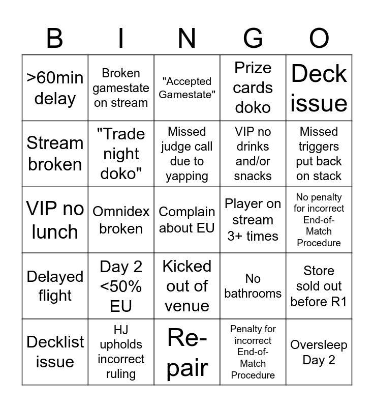 This bingo card has a free space and 24 words: Day 2 <50% EU, HJ upholds incorrect ruling, Missed judge call due to yapping, Decklist issue, Deck issue, >60min delay, Stream broken, Broken gamestate on stream, Player on stream 3+ times, Kicked out of venue, VIP no drinks and/or snacks, VIP no lunch, No bathrooms, Store sold out before R1, "Trade night doko", Penalty for incorrect End-of-Match Procedure, No penalty for incorrect End-of-Match Procedure, "Accepted Gamestate", Missed triggers put back on stack, Omnidex broken, Oversleep Day 2, Delayed flight, Prize cards doko and Re-pair.
