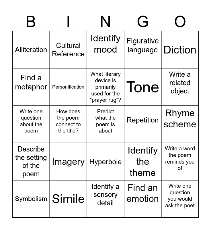 This bingo card has a free space and 24 words: Imagery, Simile, What literary device is primarily used for the "prayer rug"?, Symbolism, Diction, Alliteration, Find a metaphor, Cultural Reference, Repetition, Hyperbole, Tone, Write one question about the poem, Identify the theme, Write a word the poem reminds you of, Personification, Find an emotion, Rhyme scheme, Identify mood, Write a related object, How does the poem connect to the title?, Write one question you would ask the poet, Describe the setting of the poem, Figurative language and Identify a sensory detail.