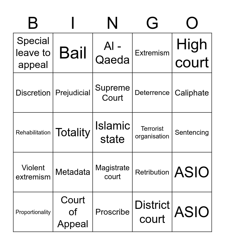 This bingo card has 26 words: Magistrate court, District court, Supreme Court, Court of Appeal, High court, Special leave to appeal, Discretion, Bail, Sentencing, Retribution, Deterrence, Rehabilitation, ASIO, Proportionality, Totality, Terrorism, Extremism, Violent extremism, Al - Qaeda, Islamic state, Caliphate, Proscribe, Terrorist organisation, Metadata, Prejudicial and ASIO.
