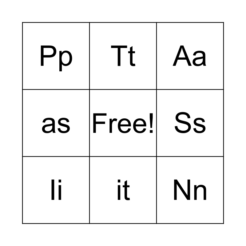 This bingo card has a free space and 8 words: Ss, Aa, Tt, Ii, Pp, Nn, as and it.