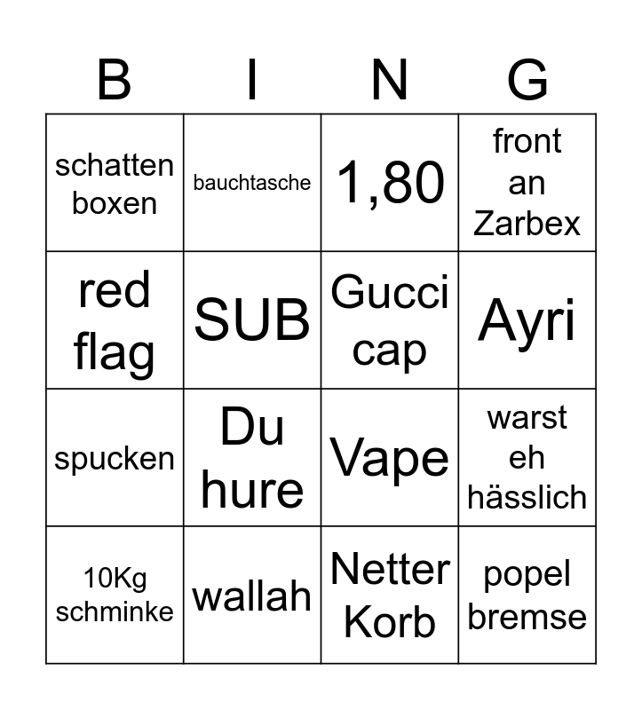 This bingo card has 16 words: wallah, warst eh hässlich, 1,80, schatten boxen, spucken, bauchtasche, Vape, Netter Korb, red flag, SUB, 10Kg schminke, front an Zarbex, Du hure, Ayri, Gucci cap and popel bremse.