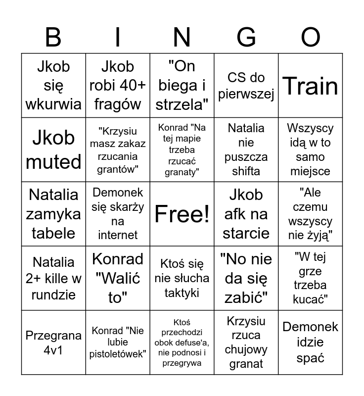 This bingo card has a free space and 24 words: Konrad "Walić to", Konrad "Nie lubie pistoletówek", Konrad "Na tej mapie trzeba rzucać granaty", Przegrana 4v1, Train, Jkob się wkurwia, Jkob muted, Jkob robi 40+ fragów, Jkob afk na starcie, Ktoś się nie słucha taktyki, Natalia nie puszcza shifta, Natalia zamyka tabele, "No nie da się zabić", "W tej grze trzeba kucać", "Krzysiu masz zakaz rzucania grantów", Krzysiu rzuca chujowy granat, "Ale czemu wszyscy nie żyją", "On biega i strzela", Wszyscy idą w to samo miejsce, Demonek się skarży na internet, Demonek idzie spać, Natalia 2+ kille w rundzie, CS do pierwszej and Ktoś przechodzi obok defuse'a, nie podnosi i przegrywa.