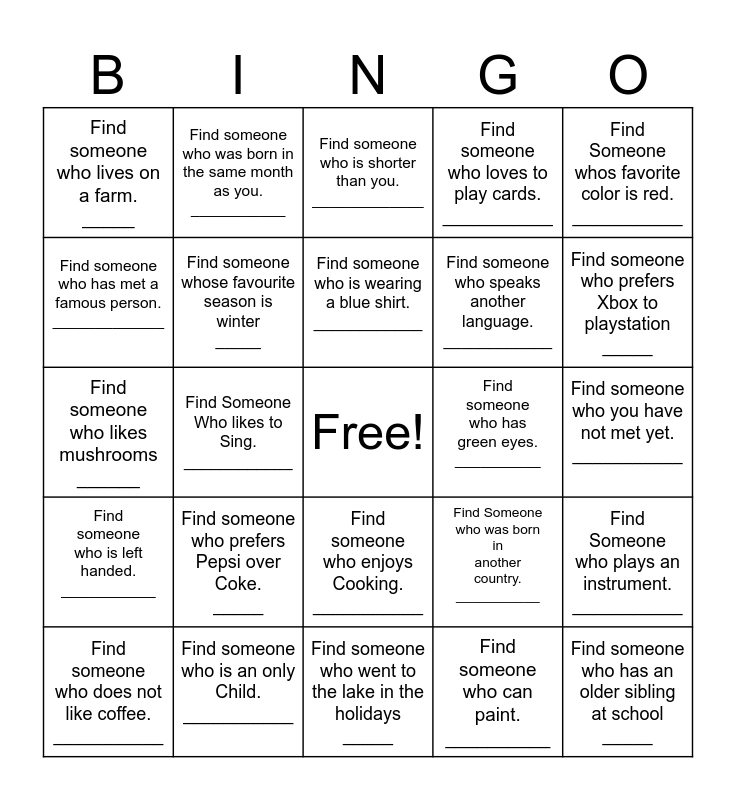 This bingo card has a free space and 24 words: Find someone who prefers Pepsi over Coke. _____, Find someone who is an only Child. ___________, Find someone who is wearing a blue shirt. ____________, Find someone who does not like coffee. ___________, Find Someone whos favorite color is red. ___________, Find someone who lives on a farm. _____, Find someone who has met a famous person. _____________, Find someone who was born in the same month as you. ___________, Find someone who has green eyes. __________, Find someone who enjoys Cooking. ___________, Find someone who speaks another language. ____________, Find someone who likes mushrooms ______, Find Someone who was born in another country. ___________, Find Someone who plays an instrument. ___________, Find someone whose favourite season is winter _____, Find someone who can paint. __________, Find someone who you have not met yet. ___________, Find someone who is shorter than you. _____________, Find someone who prefers Xbox to playstation _____, Find Someone Who likes to Sing. ____________, Find someone who has an older sibling at school _____, Find someone who is left handed. ___________, Find someone who loves to play cards. ___________ and Find someone who went to the lake in the holidays _____.