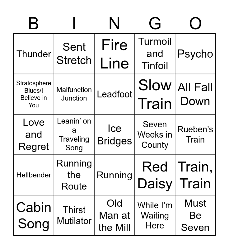 This bingo card has a free space and 24 words: Running the Route, Thirst Mutilator, Leadfoot, Cabin Song, Psycho, Thunder, Stratosphere Blues/I Believe in You, Sent Stretch, Seven Weeks in County, Running, Slow Train, Love and Regret, Red Daisy, Train, Train, Malfunction Junction, While I’m Waiting Here, Rueben’s Train, Fire Line, All Fall Down, Leanin’ on a Traveling Song, Must Be Seven, Hellbender, Turmoil and Tinfoil and Old Man at the Mill.