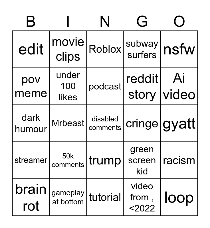 This bingo card has a free space and 24 words: 50k comments, gameplay at bottom, podcast, brain rot, nsfw, edit, pov meme, movie clips, cringe, trump, reddit story, dark humour, green screen kid, racism, under 100 likes, video from ,<2022, gyatt, Roblox, Ai video, Mrbeast, loop, streamer, subway surfers and tutorial.