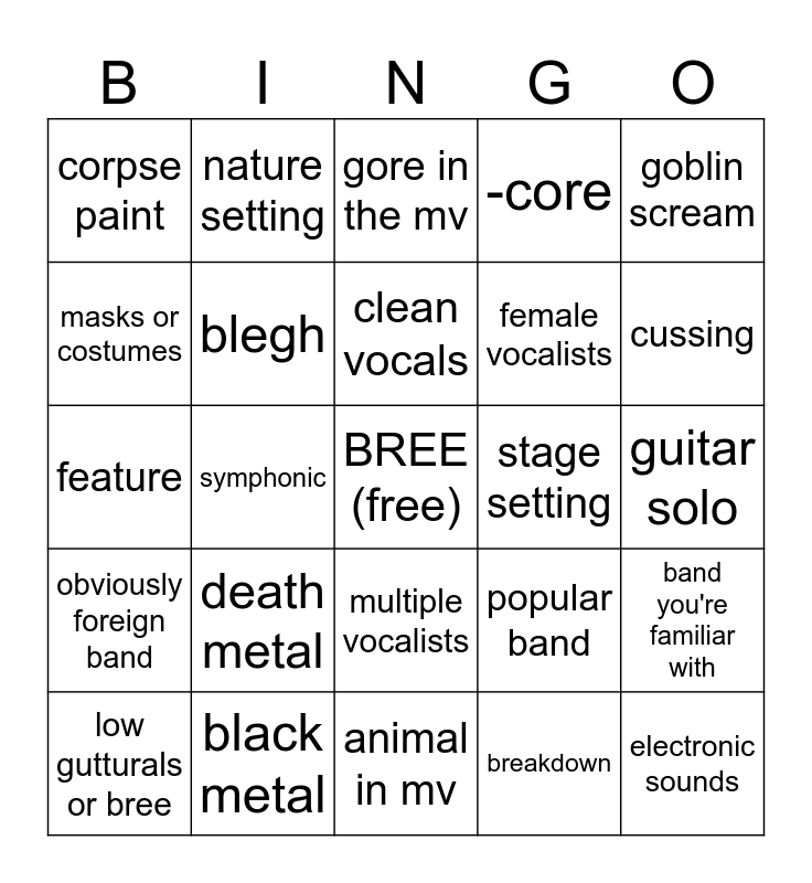 This bingo card has a free space and 24 words: death metal, black metal, clean vocals, low gutturals or bree, goblin scream, corpse paint, masks or costumes, nature setting, stage setting, multiple vocalists, female vocalists, feature, popular band, band you're familiar with, blegh, breakdown, guitar solo, gore in the mv, cussing, symphonic, electronic sounds, obviously foreign band, -core and animal in mv.