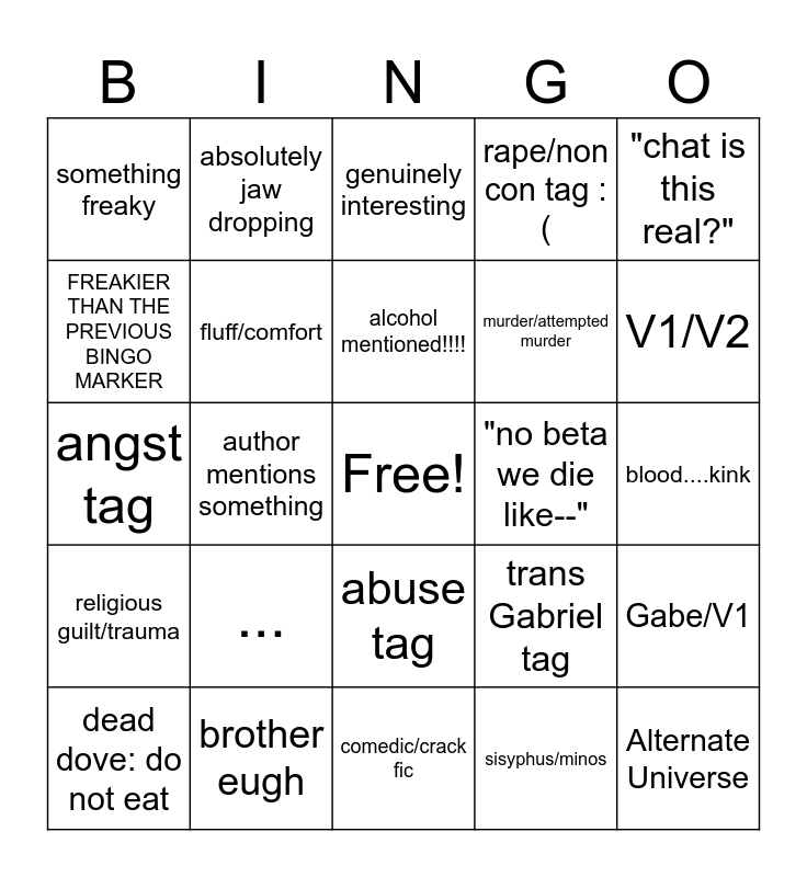This bingo card has a free space and 24 words: ..., brother eugh, alcohol mentioned!!!!, dead dove: do not eat, "chat is this real?", something freaky, FREAKIER THAN THE PREVIOUS BINGO MARKER, absolutely jaw dropping, "no beta we die like--", abuse tag, murder/attempted murder, angst tag, trans Gabriel tag, Gabe/V1, fluff/comfort, sisyphus/minos, blood....kink, genuinely interesting, V1/V2, author mentions something, Alternate Universe, religious guilt/trauma, rape/non con tag :( and comedic/crack fic.
