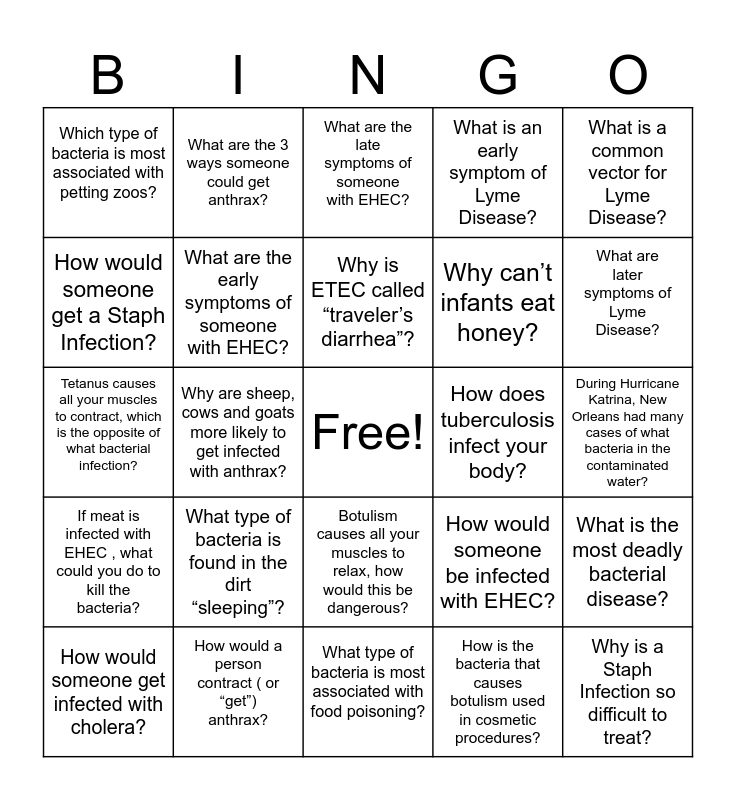 This bingo card has a free space and 24 words: What type of bacteria is found in the dirt “sleeping”?, How would a person contract ( or “get”) anthrax?, Why is ETEC called “traveler’s diarrhea”?, How would someone get infected with cholera?, What is a common vector for Lyme Disease?, Which type of bacteria is most associated with petting zoos?, How would someone get a Staph Infection?, What are the 3 ways someone could get anthrax?, How does tuberculosis infect your body?, Botulism causes all your muscles to relax, how would this be dangerous?, Why can’t infants eat honey?, Tetanus causes all your muscles to contract, which is the opposite of what bacterial infection?, How would someone be infected with EHEC?, What is the most deadly bacterial disease?, What are the early symptoms of someone with EHEC?, How is the bacteria that causes botulism used in cosmetic procedures?, During Hurricane Katrina, New Orleans had many cases of what bacteria in the contaminated water?, What are the late symptoms of someone with EHEC?, What are later symptoms of Lyme Disease?, Why are sheep, cows and goats more likely to get infected with anthrax?, Why is a Staph Infection so difficult to treat?, If meat is infected with EHEC , what could you do to kill the bacteria?, What is an early symptom of Lyme Disease? and What type of bacteria is most associated with food poisoning?.
