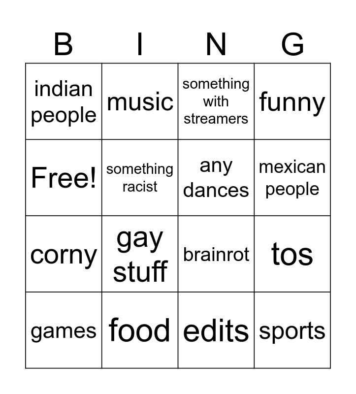 This bingo card has 16 words: food, tos, something with streamers, indian people, corny, music, brainrot, edits, Free!, something racist, games, funny, gay stuff, mexican people, any dances and sports.