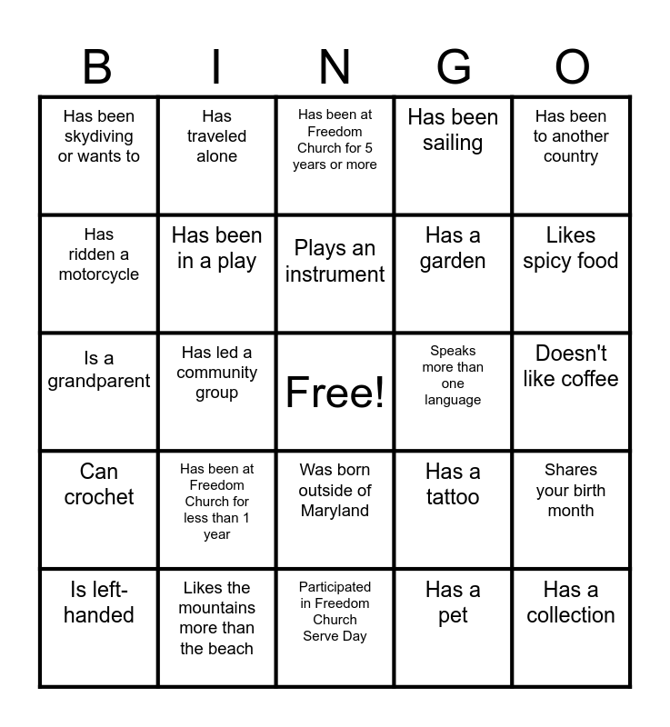 This bingo card has a free space and 24 words: Has been at Freedom Church for less than 1 year, Likes the mountains more than the beach, Plays an instrument, Is left-handed, Has been to another country, Has been skydiving or wants to, Has ridden a motorcycle, Has traveled alone, Speaks more than one language, Was born outside of Maryland, Has a garden, Is a grandparent, Has a tattoo, Shares your birth month, Has been in a play, Has a pet, Doesn't like coffee, Has been at Freedom Church for 5 years or more, Likes spicy food, Has led a community group, Has a collection, Can crochet, Has been sailing and Participated in Freedom Church Serve Day.