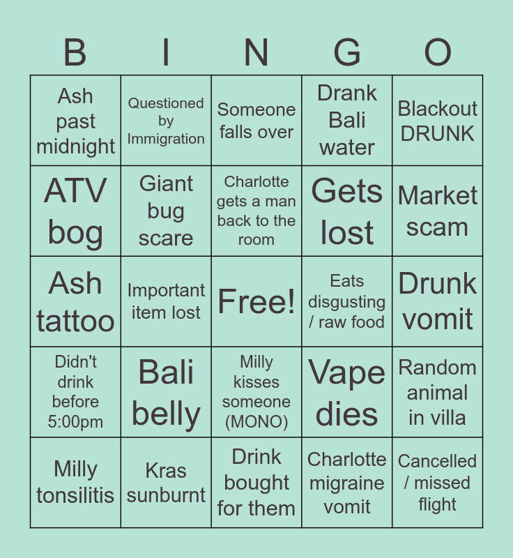 This bingo card has a free space and 24 words: Bali belly, Kras sunburnt, Charlotte gets a man back to the room, Milly tonsilitis, Blackout DRUNK, Ash past midnight, ATV bog, Questioned by Immigration, Eats disgusting / raw food, Milly kisses someone (MONO), Gets lost, Ash tattoo, Vape dies, Random animal in villa, Giant bug scare, Charlotte migraine vomit, Drunk vomit, Someone falls over, Market scam, Important item lost, Cancelled / missed flight, Didn't drink before 5:00pm, Drank Bali water and Drink bought for them.