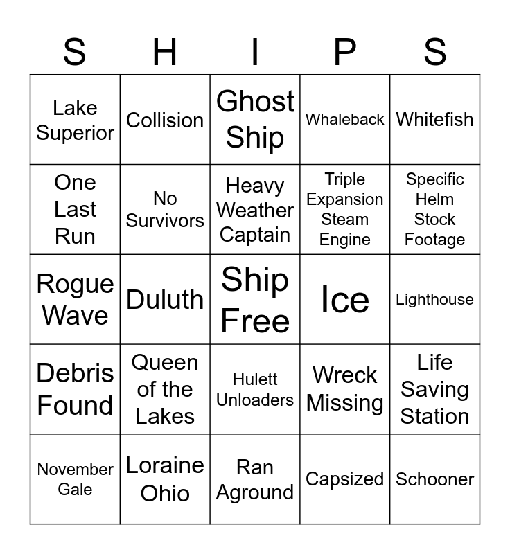 This bingo card has a free space and 24 words: Queen of the Lakes, Loraine Ohio, Heavy Weather Captain, November Gale, Whitefish, Lake Superior, One Last Run, Collision, Ice, Hulett Unloaders, Triple Expansion Steam Engine, Rogue Wave, Wreck Missing, Life Saving Station, No Survivors, Capsized, Lighthouse, Ghost Ship, Specific Helm Stock Footage, Duluth, Schooner, Debris Found, Whaleback and Ran Aground.