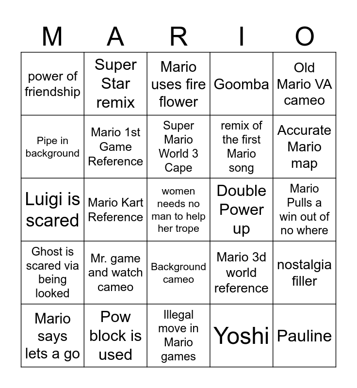 This bingo card has a free space and 24 words: Mario says lets a go, Mr. game and watch cameo, Super Mario World 3 Cape, Yoshi, Old Mario VA cameo, power of friendship, Super Star remix, Mario uses fire flower, Double Power up, Mario Pulls a win out of no where, Luigi is scared, Mario 1st Game Reference, Mario 3d world reference, nostalgia filler, Pipe in background, Pow block is used, Illegal move in Mario games, Goomba, Accurate Mario map, Ghost is scared via being looked, Mario Kart Reference, Background cameo, remix of the first Mario song and Pauline.