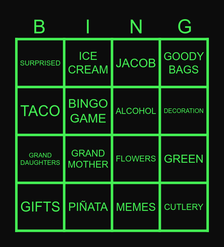 This bingo card has 50 words: INVITATION, GIFTS, PARTY, HAPPY BIRTHDAY, PARTY HATS, CAKE, ICE CREAM, WEED, BINGO GAME, BALLOONS, ALCOHOL, GOODY BAGS, CUP CAKES, CANDLE, BONGS, CELEBRATION, DECORATION, PIÑATA, FOOD, TACO, GREEN, MUSIC REBEL ROCK, SURPRISED, GRAND DAUGHTERS, ELIZABETH, EMBER, GRAND MOTHER, MOTHER, JACOB, MICHAELA, WILLOW, ANIMAL LOVER, BANSHEE, DOOGIE, VITO, BITZY, DAISY, RELIGIOUS, LOVES FISHING, MEMES, BEVERAGE, TABLE CLOTHS, VIDEO CAMERA, THANK YOU CARDS, CANDY, FLOWERS, CLOWNS, PLATES, CUTLERY and PLATTERS.
