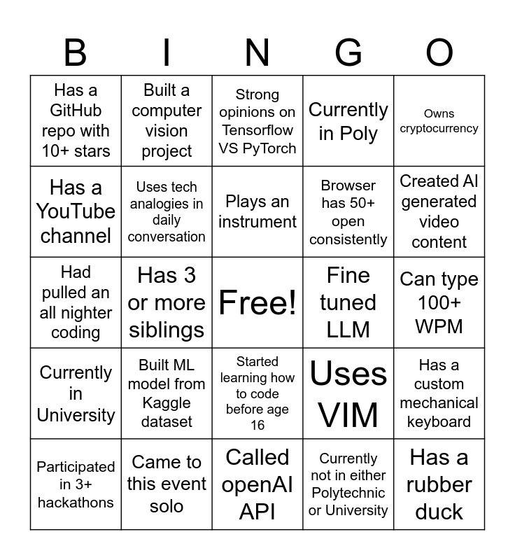 This bingo card has a free space and 25 words: Built ML model from Kaggle dataset, Called openAI API, Plays an instrument, Participated in 3+ hackathons, Owns cryptocurrency, Has a GitHub repo with 10+ stars, Has a YouTube channel, Built a computer vision project, Fine tuned LLM, Started learning how to code before age 16, Browser has 50+ open consistently, Had pulled an all nighter coding, Uses VIM, Has a custom mechanical keyboard, Uses tech analogies in daily conversation, Has strong opinions on which IDE is the best, Can type 100+ WPM, Strong opinions on Tensorflow VS PyTorch, Created AI generated video content, Has 3 or more siblings, Has a rubber duck, Came to this event solo, Currently in University, Currently in Poly and Currently not in either Polytechnic or University.