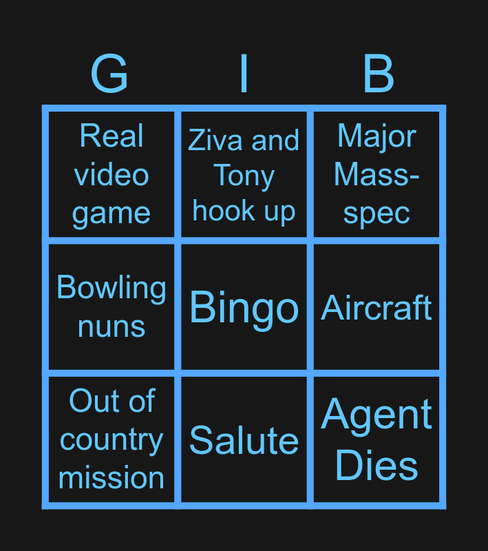 This bingo card has a free space and 8 words: Bowling nuns, Ziva and Tony hook up, Aircraft, Out of country mission, Major Mass-spec, Real video game, Salute and Agent Dies.