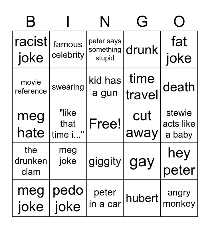 This bingo card has a free space and 24 words: meg joke, pedo joke, kid has a gun, meg joke, fat joke, racist joke, movie reference, famous celebrity, cut away, giggity, time travel, meg hate, gay, hey peter, swearing, hubert, stewie acts like a baby, peter says something stupid, death, "like that time i...", angry monkey, the drunken clam, drunk and peter in a car.